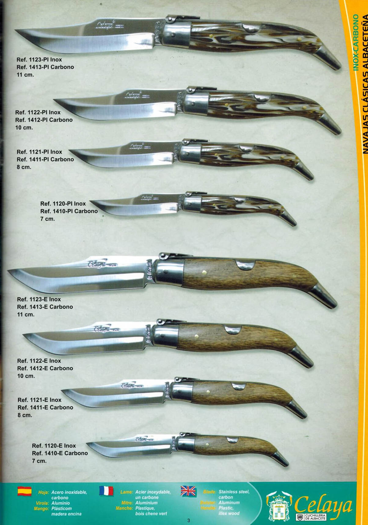 Con hojas de acero inoxidable o acero carbono de distintas medidas. Sus mangos son de madera natural de encina o plástico imitación asta de toro. Con virola de aluminio y bloqueo de palanquilla.