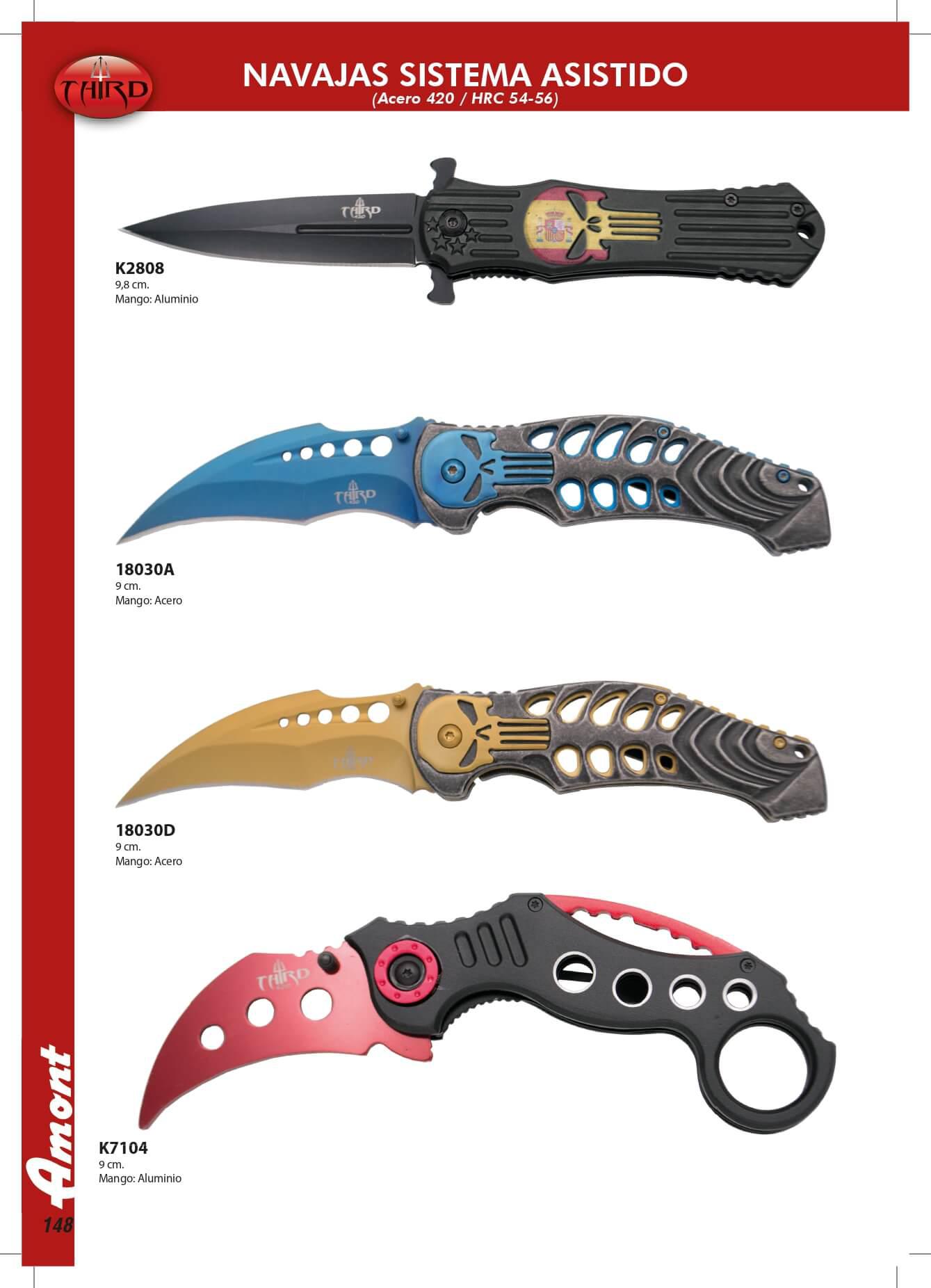 Navajas con sistema de apertura asistido. K2808 Hoja de 8.5 cm. Mango: aluminio. 18030A Hoja: 9 cm. Mango: acero. 18030D Hoja: 9 cm. Mango: acero.K7104: Navaja karambit entrenamientoHoja: 9 cm. Mango: acero.