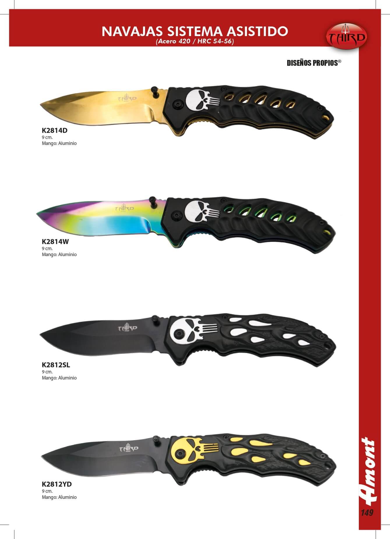 Navajas con sistema de apertura asistido. K2814D Hoja de 9 cm. Mango: aluminio. K2814W Hoja: 9 cm. Mango: aluminio. K2812SL Hoja: 9 cm. Mango: aluminio. K2812YD Hoja: 9 cm. Mango: aluminio.
