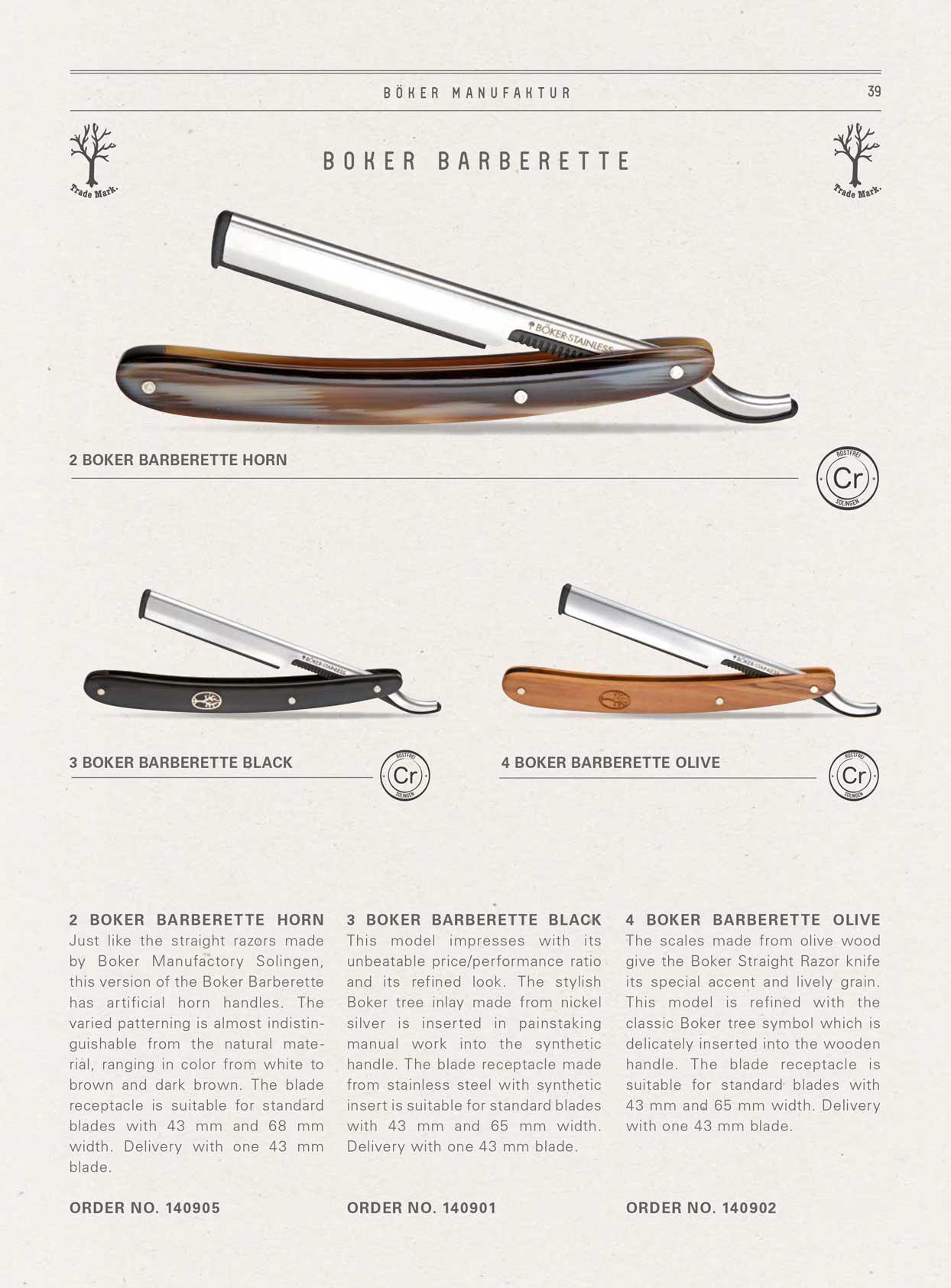 Los mangos de la navaja de afeitar recta siguen la de las navajas de afeitar forjadas hechas por la fábrica de Boker y no dejan nada que desear. Puede elegir entre sintético resistente a la humedad con incrustaciones de níquel plateado, madera de olivo seleccionada a mano con grano contrastante y ornamentación elaborada. La Boker Barberette combina practicidad profesional con el manejo y el equilibrio habituales y la estética auténtica de una navaja de afeitar clásica. Además, ofrece una alternativa de precio a las navajas de afeitar forjadas para principiantes.
