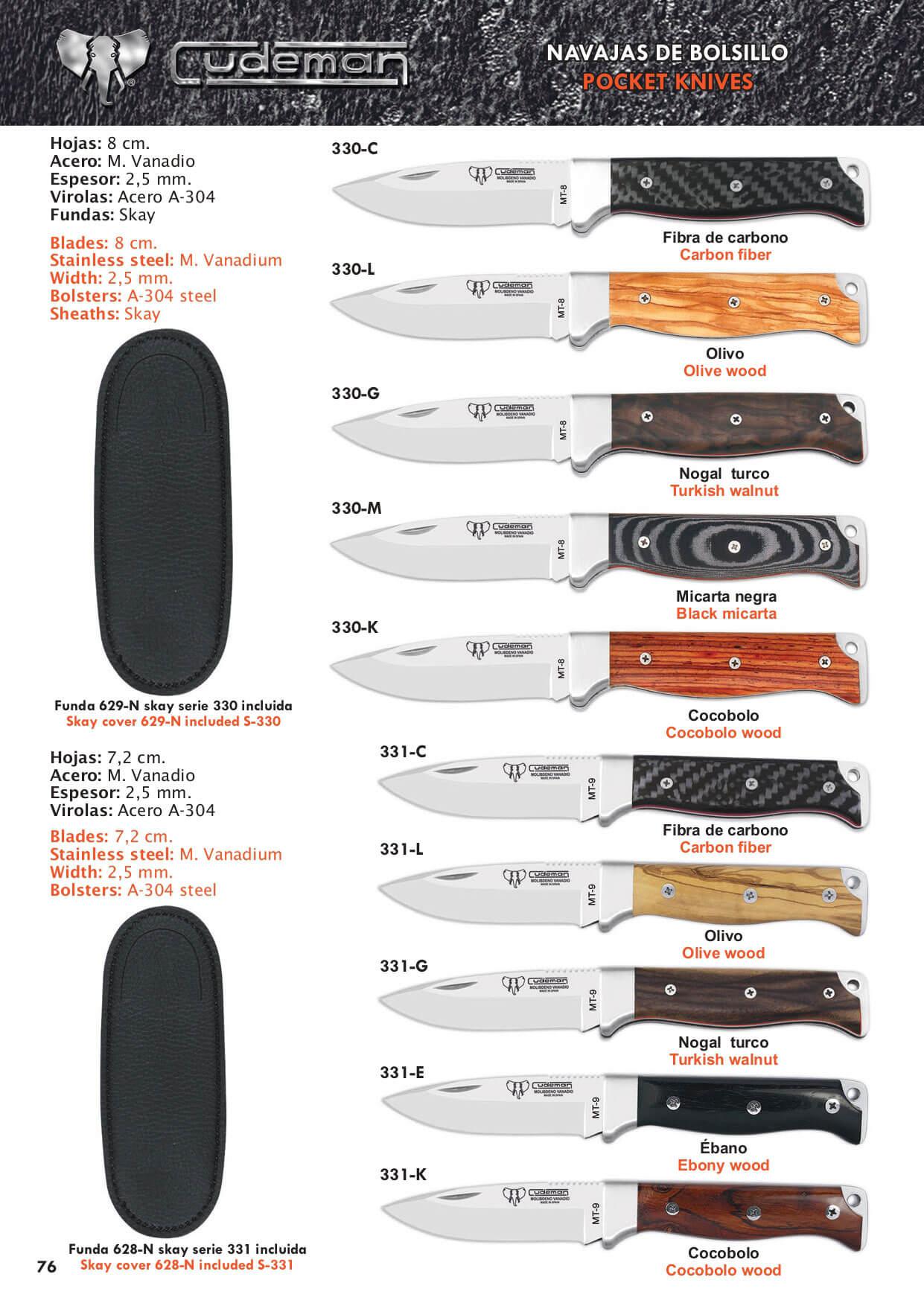 Hoja de molibdeno vanadio de 8 cm, con 2,5 mm de espesor. Longitud total: 17 cm. Ancho de pala 2 cm. Virolas de acero A-304. Cierre de pistón. Con funda de skay negra incluida.