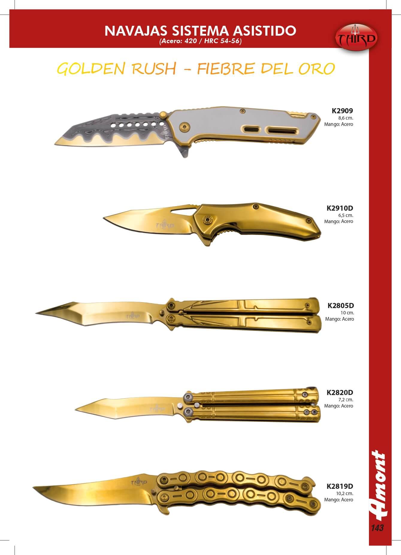 Navajas abanico y sport en color dorado. Mango de acero. Hoja de acero 420.