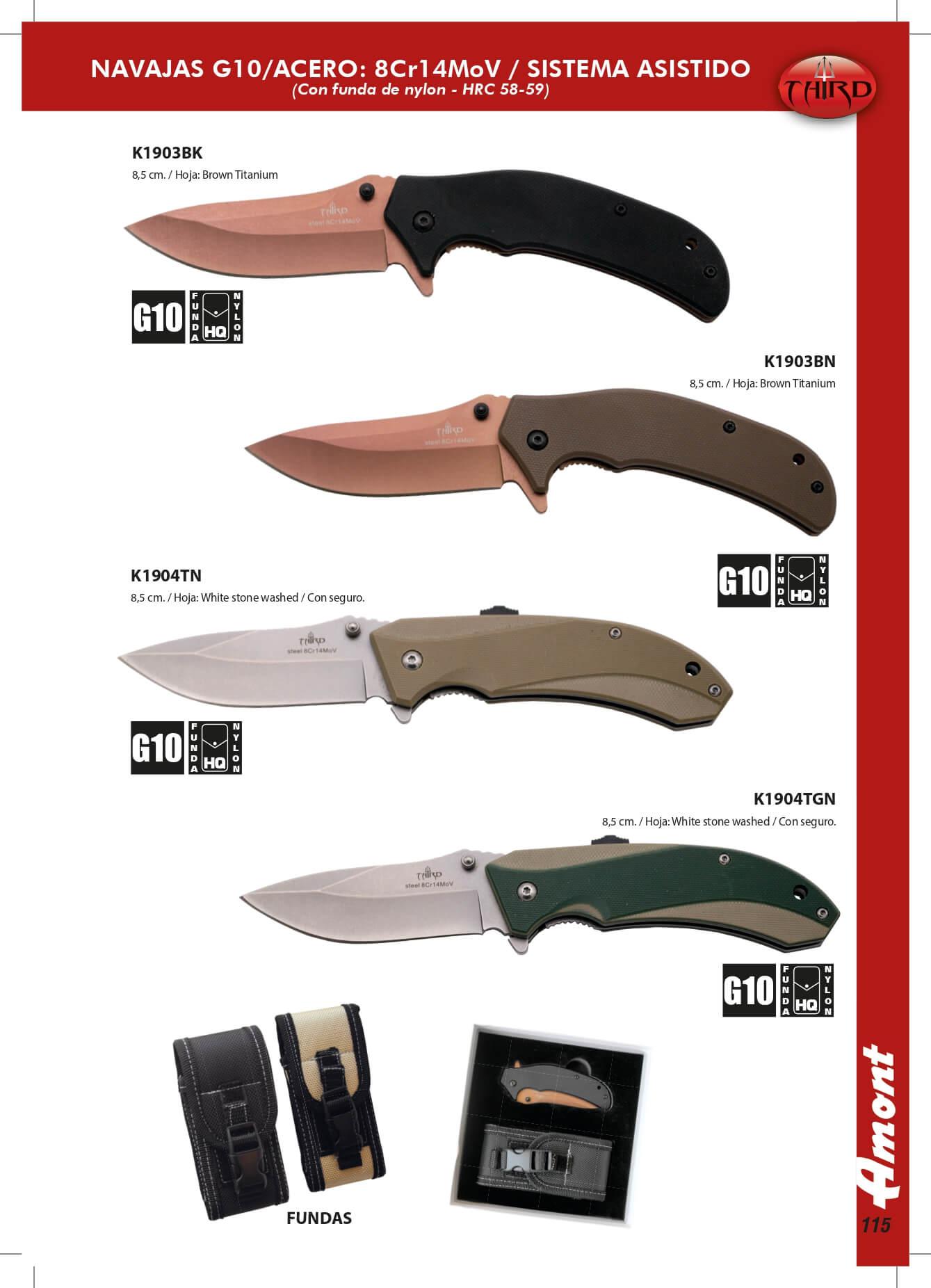 Navajas G10 con acero 8Cr14MoV y sistema asistido. Incluyen funda.