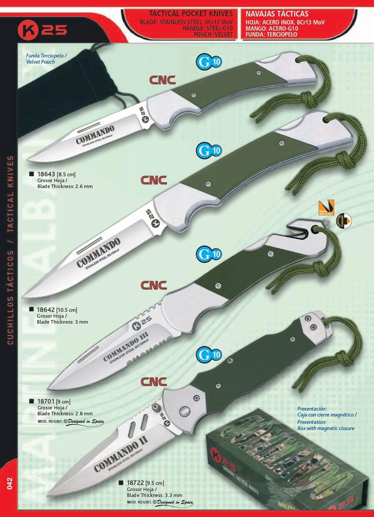 Navajas Tácticas Commando con hoja de acero inoxidable 8Cr13 MoV, mango de acero y G-10 y funda de terciopelo.