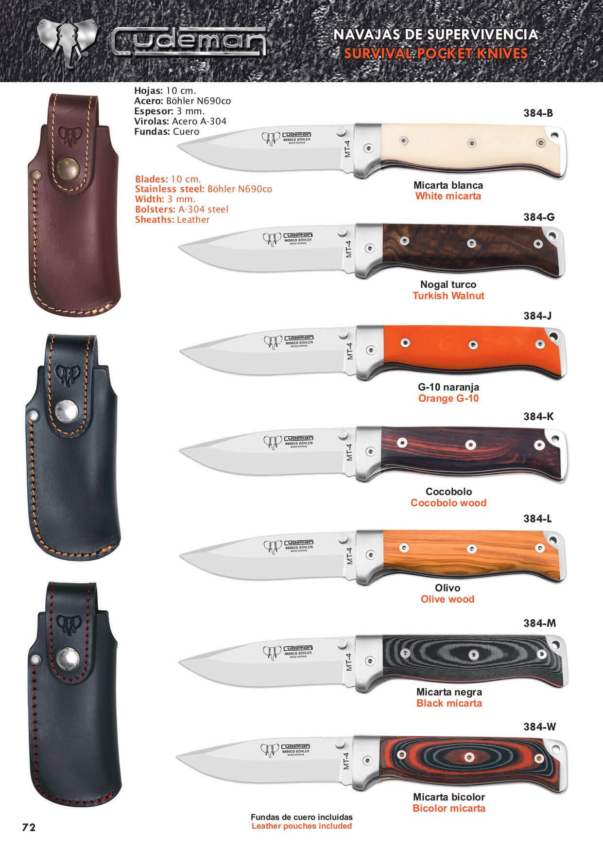 Hoja de acero Böhler N690Co de 10 cm de largo. 3 mm de espesor. Ancho de pala: 2,7 mm. Longitud total: 21,5 cm. Virolas en acero A-304. Bloqueo trasero. Incluye funda de cuero.