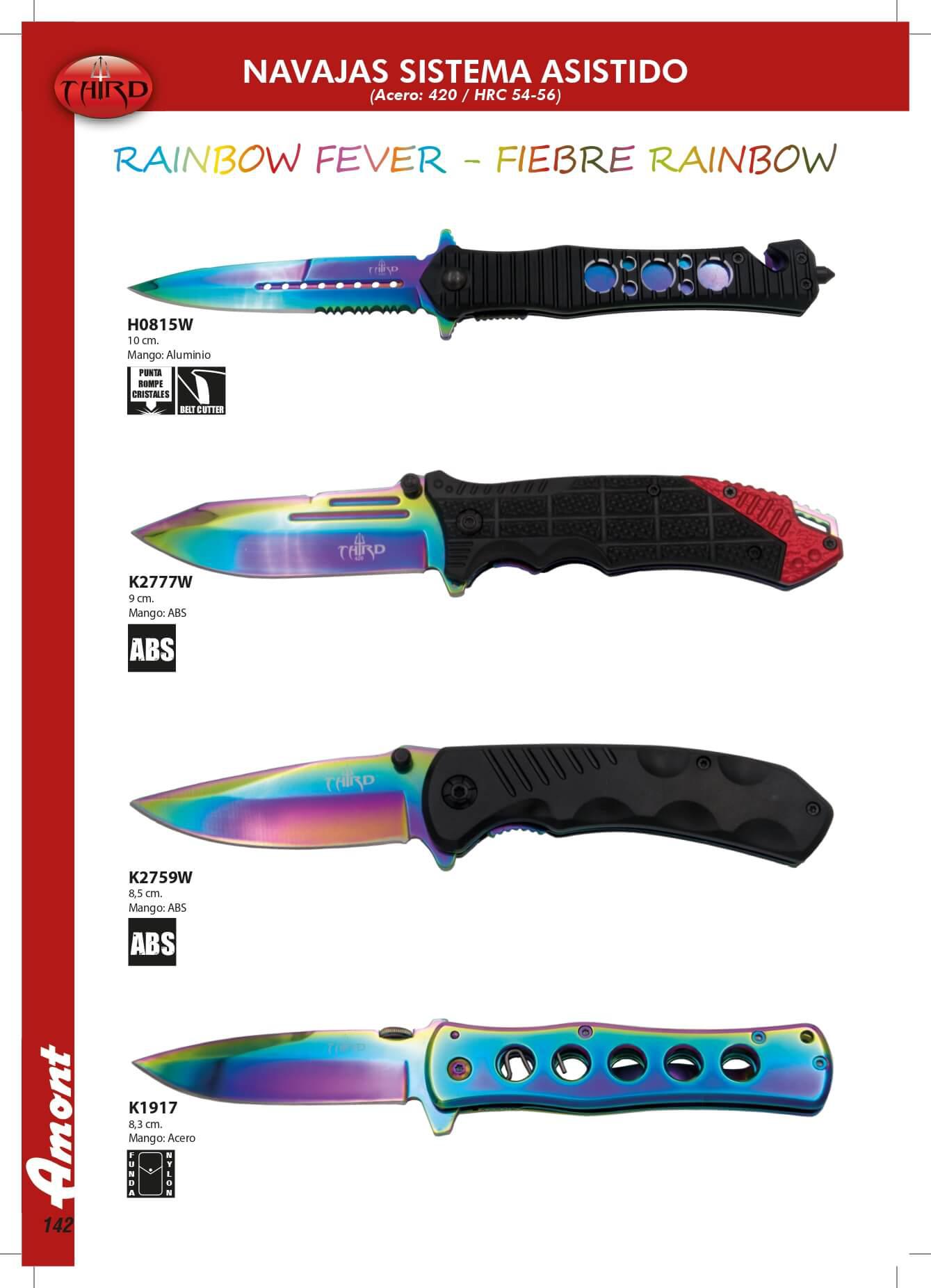 Navajas Rainbow. Hoja: acero 420. HRC 54-56. H0815W Hoja: 10 cm. Mango: Aluminio. Punta rompe cristales. Corta cinturones. K2777W Hoja: 9 cm. Mango: ABS. K2759W Hoja: 8,5 cm. Mango: ABS. K1917 Hoja: 8,3 cm. Mango: Acero. Incluye funda de nylon.