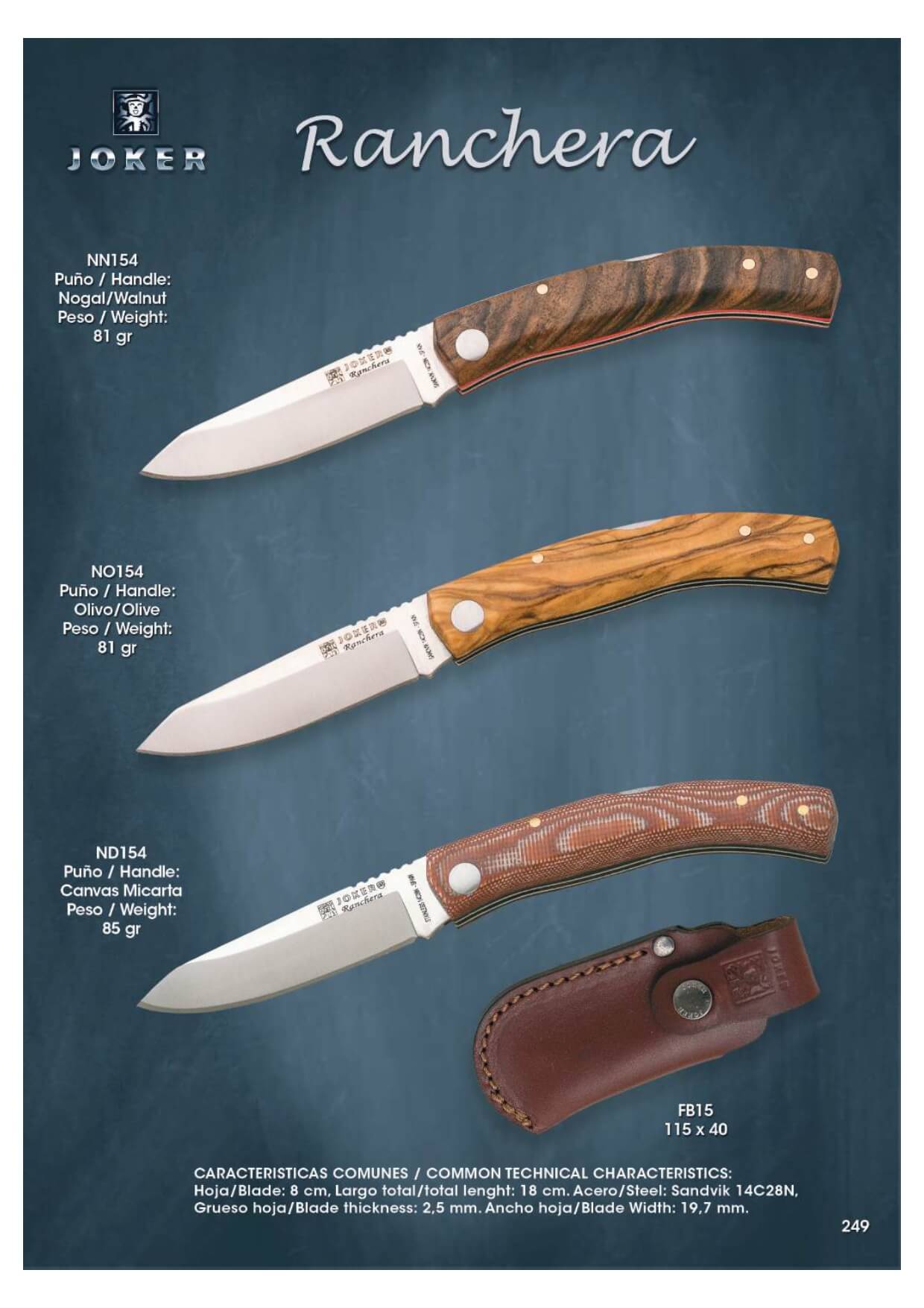 Navajas de bolsillo Joker Ranchera con hoja de acero Sandvik 14C28N de 8 cm de longitud. Con bloqueo de botón trasero.