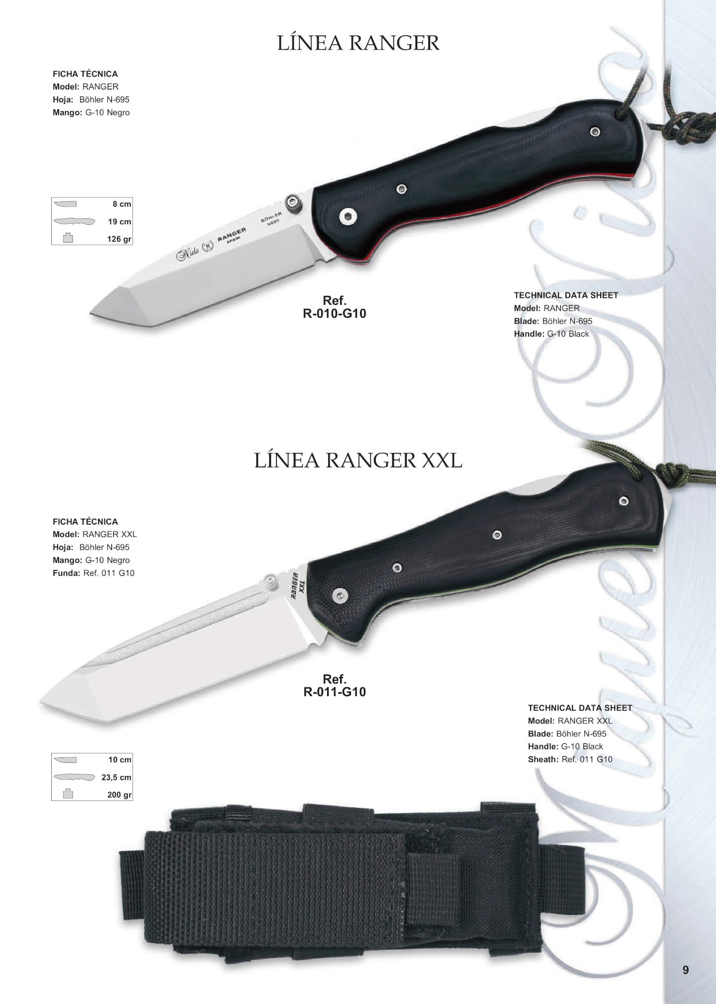 Navajas tácticas Nieto línea Ranger con mango de G10 negro y bloqueo de botón trasero. Con cordón fiador.