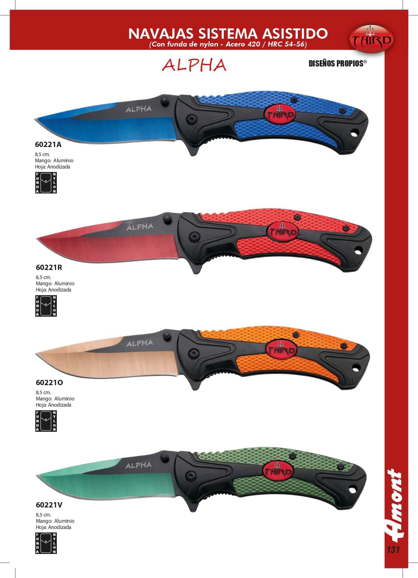 Navajas Alpha. Apertura asistida. Con funda de Nylon. Hoja de acero 420. HRC 54-56. Anodizada. Longitud de hoja: 8.5 cm. Mango: Aluminio.