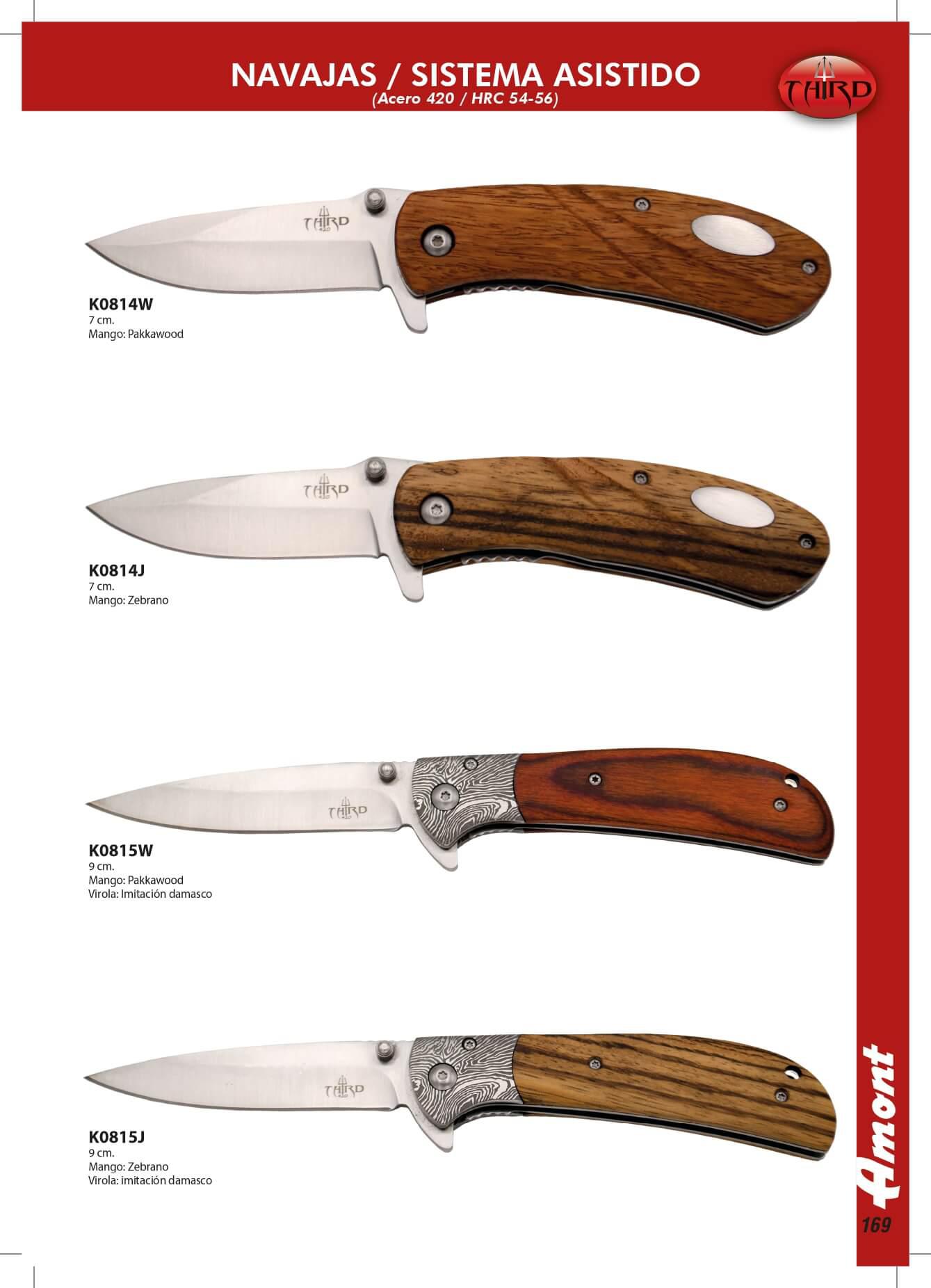 Navajas con sistema de apertura asistido. Hoja de acero 420. K0814W Mango: pakkawood. Hoja: 7 cm. K0814J Mango: zebrano. Hoja: 7 cm. K0815W Mango: pakkawood. Virola: imitación damasco. Hoja: 9 cm. K0815J Mango: zebrano. Virola: imitación damasco. Hoja: 9 cm.