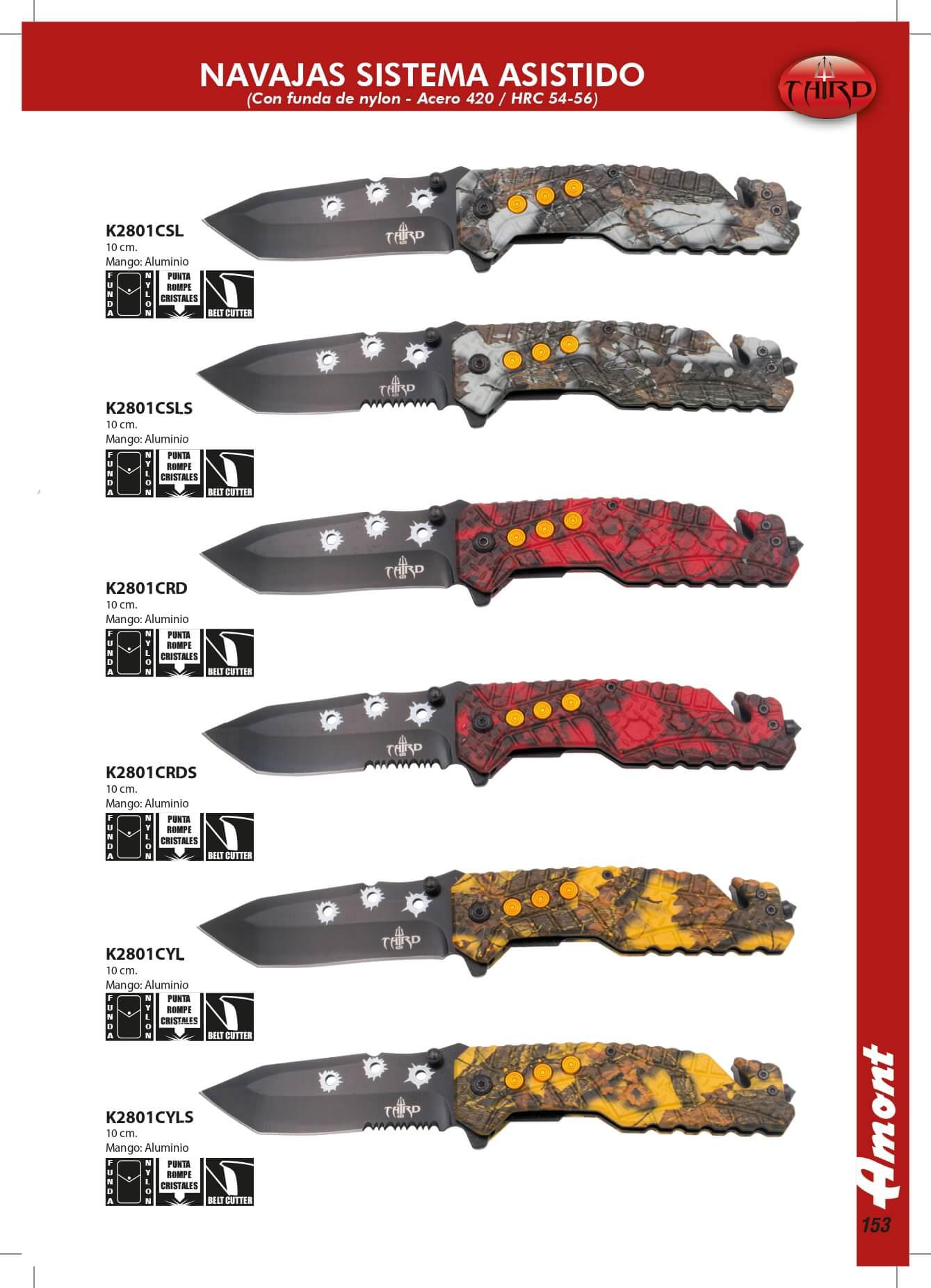 Navajas con apertura asistida. Hoja de acero 420. HRC 54-56. Longitud de hoja: 10 cm. Mango: aluminio. Incluye funda de nylon. Punta rompe cristales. Corta cinturones.
