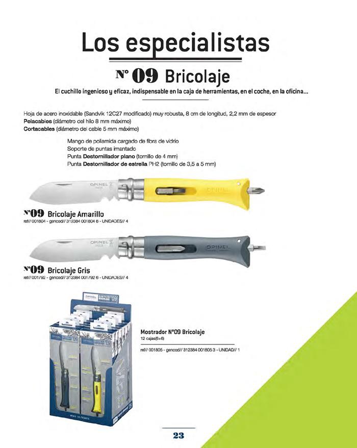 Hoja de acero inoxidable (Sandvik 12C27 modificado) muy robusta, 8 cm de longitud, 2, mm de espesor. Pelacables (diámetro del hilo 8 mm máximo). Cortacables (diámetro del cable 5 mm máximo). Mango de poliamida cargado de fibr de vidrio. Soporte de puntas imantado. Puntas destornillador plano (tornillo de 4 mm). Puntas destornillador estrella PH2 (tornillo de 3,5 a 5 mm).