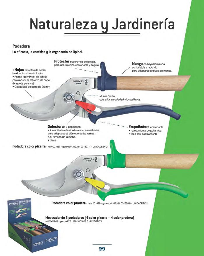 Tope anti-deslizamiento. 001627 Podadora color pizarra. 001628 Podadora colos pradera. 001843 Mostrador de 8 podadoras (4 color pizarra + 4 color pradera).