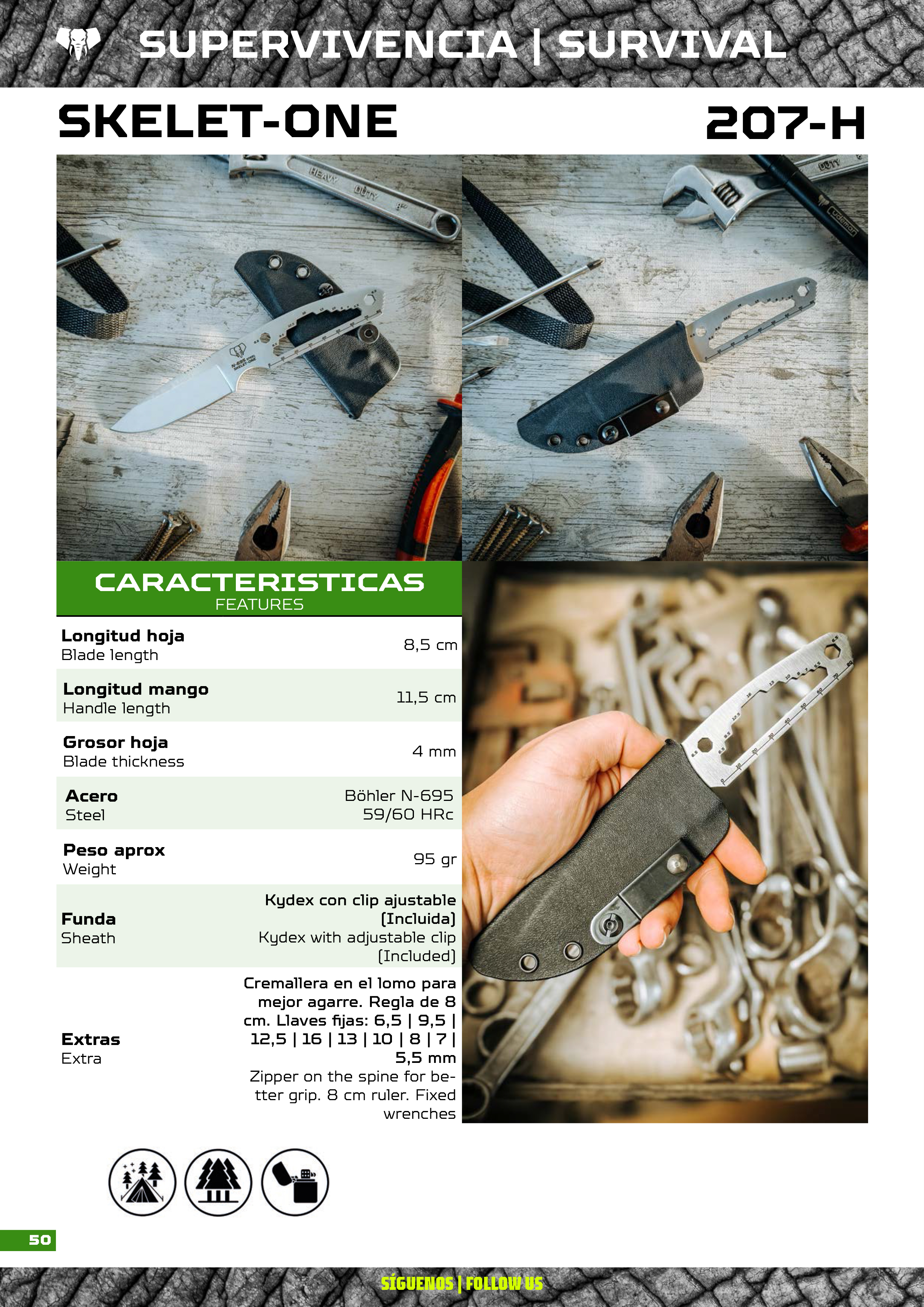 Cuchillo de Supervivencia Cudeman Skelet-one con una hoja de 8.50cm de acero BÖHLER N695. Incluye funda de kydex negra.