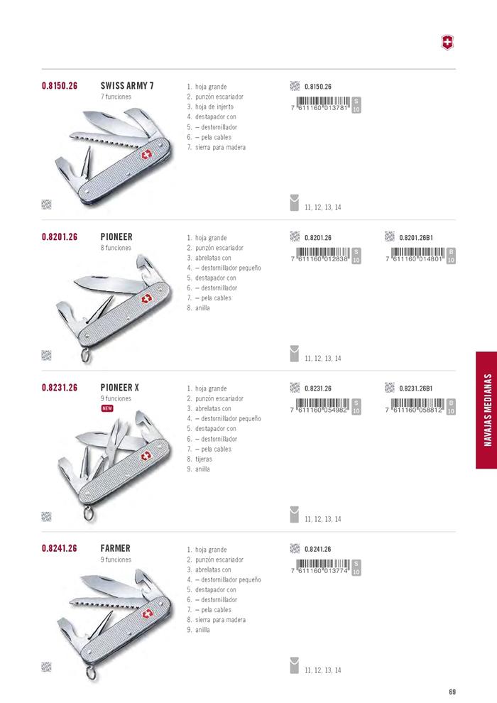 hoja grande, tijeras, punzón escariador, abrelatas, destornillador 3 mm, destapador, destornillador 7.5 mm, pela cables, anilla.