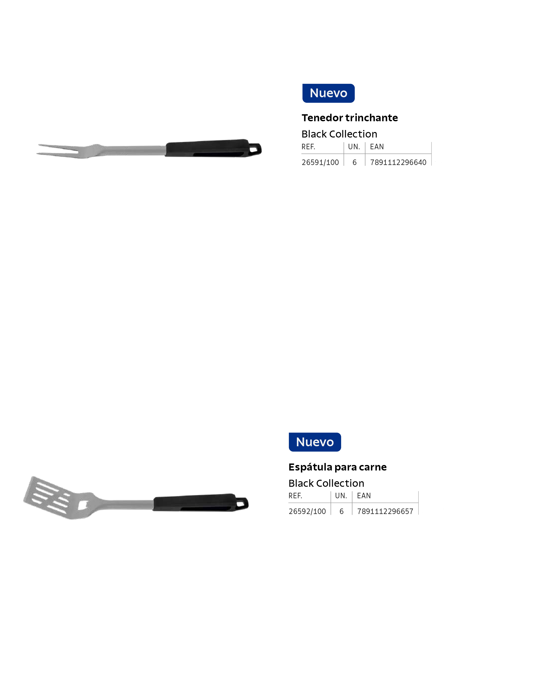 Tenedor trinchante y espátula para carne perfectos para tus barbacoas o para el uso diario en tu cocina. Estos utensilios ofrecen un rendimiento más que satisfactorio, además que gran resistencia gracias a que están fabricados con acero inoxidable y mangos de prolipopileno negro.
