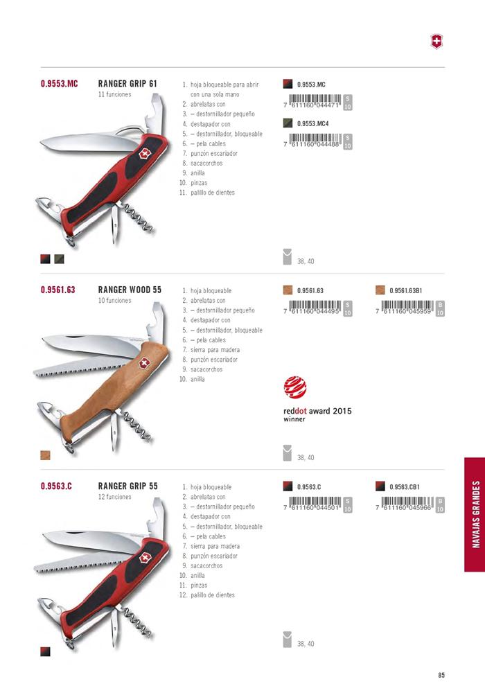 anilla, palillo de dientes, pinzas, abrelatas, destornillador 3 mm, hoja grande con bloqueo y agujero para el dedo pulgar facilitando así, su apertura con una sola mano, destapador, destornillador bloqueable 5 mm, pela cables, punzón escariador, sacacorchos.
