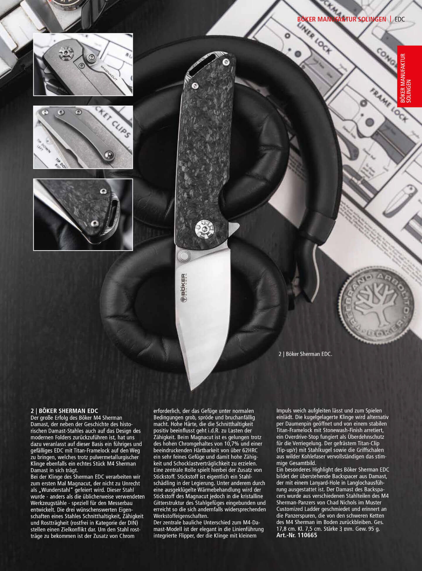 The Sherman EDC knife is a robust and compact knife with a 7.5 cm Magnacut steel blade and carbon fiber scales.