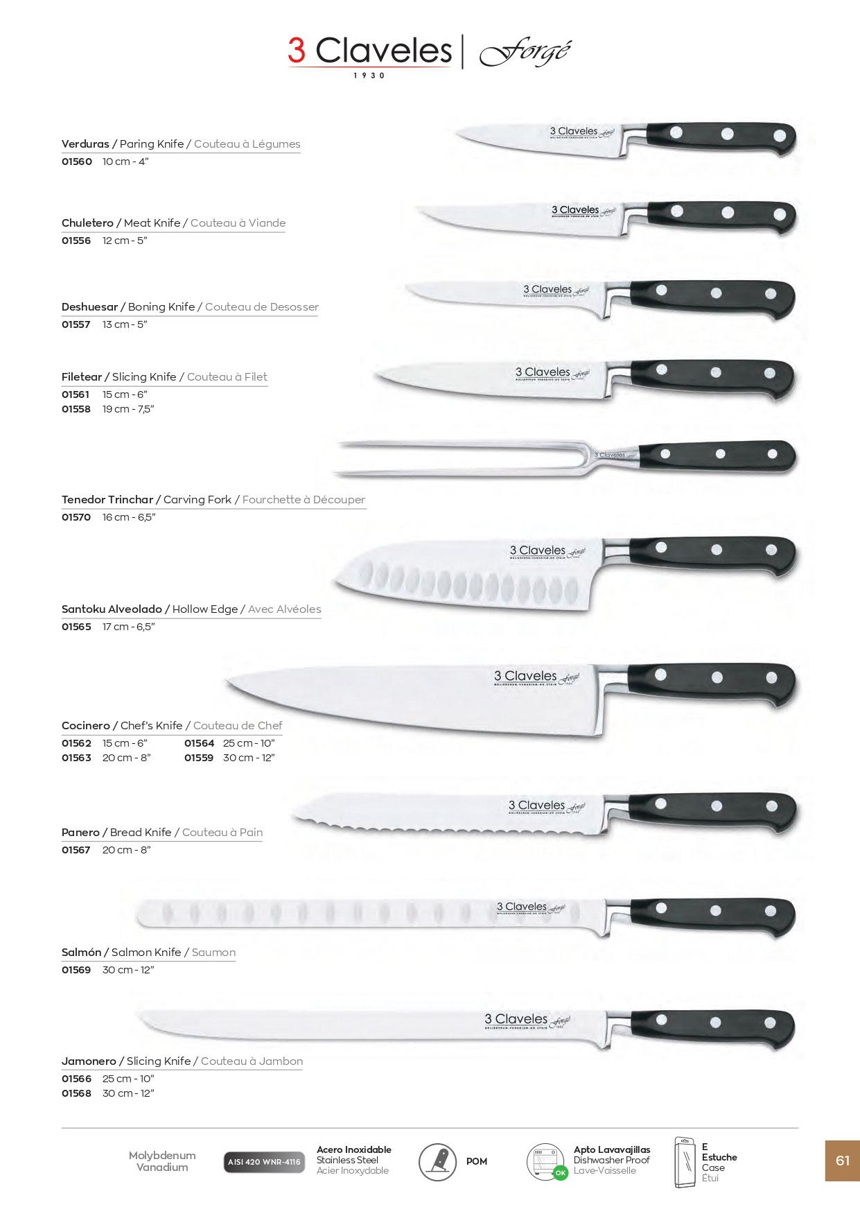 Couteaux forgés en acier inoxydable AISI 420 WNR-4116. Poignée POM ergonomique, résistante et confortable. Lame en acier inoxydable et poignée en POM. Couteau à légumes, cuisinier, pain, escalope, boner, filet, fourchette à découper, Santoku.