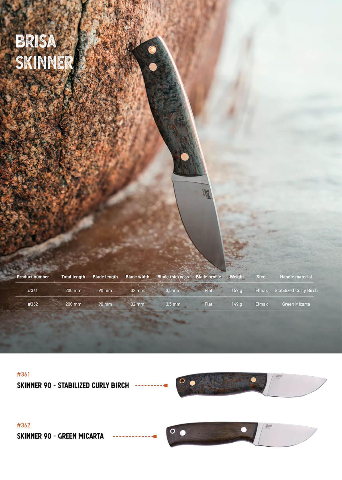 Le couteau Brisa skinner a une forme de lame large équilibrée pour les chasseurs et le bushcraft. La lame est fabriquée à partir d'acier inoxydable en poudre Elmax pour des performances et une durée de vie optimales avec une mouture plate, elle est donc bien adaptée aux tâches quotidiennes et fait également le travail lors de la préparation des aliments dans la cuisine.
