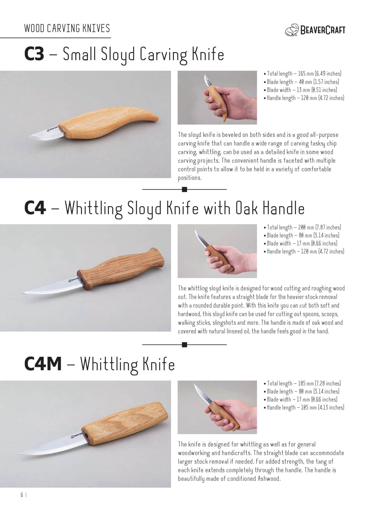 Couteaux à sculpter avec des lames en acier au carbone et des manches en frêne et en chêne. Ces couteaux sont conçus pour sculpter de petites pièces, de grandes surfaces ou même des zones plus détaillées. Ces couteaux ont une lame très résistante et leurs manches permettent de les tenir confortablement dans différentes positions.