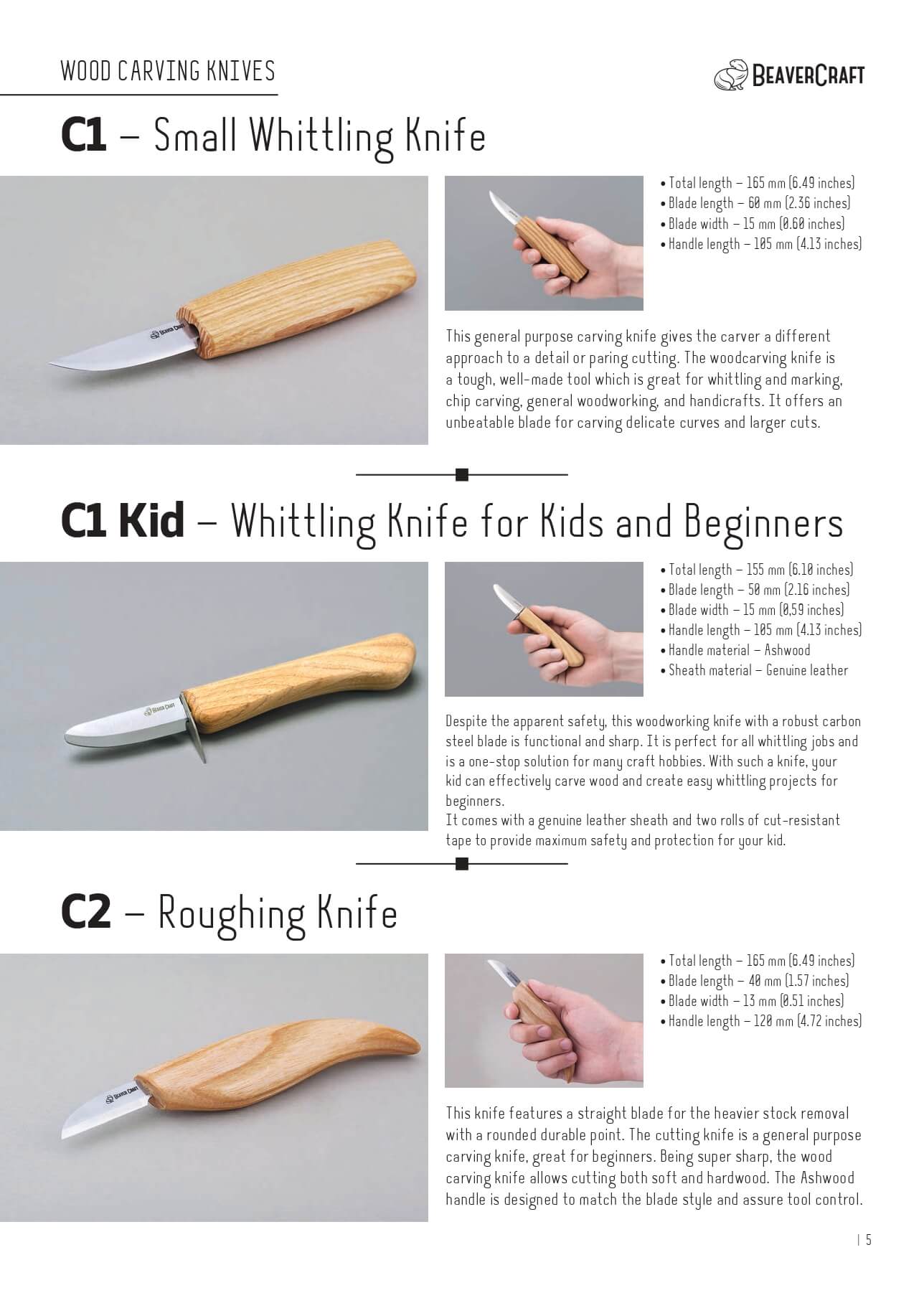 Couteaux à sculpter avec des lames en acier au carbone et des manches en bois de frêne. Ces couteaux sont conçus pour que vous puissiez sculpter de différentes manières, avec eux vous pouvez sculpter à la fois de grandes pièces pour enlever les parties de bois en excès, ainsi que pour de petits détails ou pour la sculpture générale, comme les courbes ou les formes. Ces couteaux sont sûrs et protègent l'utilisateur de toute coupure, en particulier celui conçu pour les enfants.