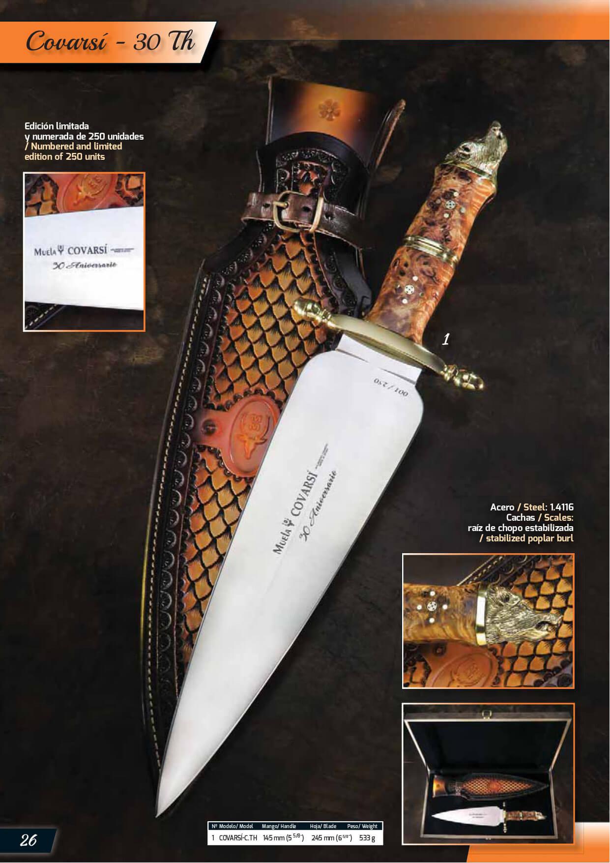 Le couteau Covarsi est l'un des couteaux les plus connus de Muela, créé en hommage à M. Antonio Covarsí, et c'est pourquoi à son 30e anniversaire, ils ont voulu lui rendre hommage avec ce nouveau couteau de luxe en édition limitée: Covarsi-C.TH. Un objet de collection, bien que parfaitement créé et prêt à servir de couteau de finition dans le dernier jeu de chasse à Monteria. Limité à 250 unités.