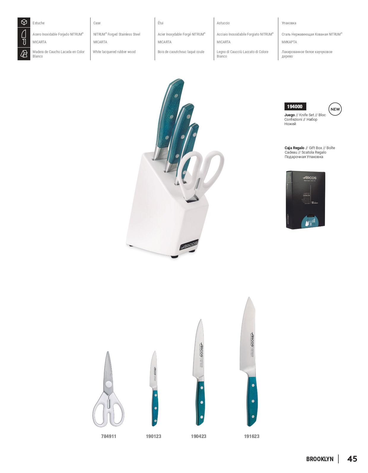 Lames en acier forgé NITRUM et poignées en micarta aigue-marine. Bloc en bois en caoutchouc laqué blanc. Comprend: rocking santoku à lame de 19 cm, couteau de chef à lame de 15 cm, couteau à lame de 10 cm et ciseaux de cuisine de 19,5 cm avec manche en polypropylène blanc.