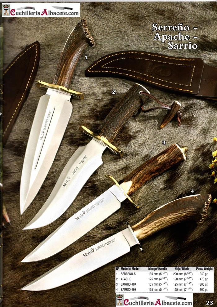 Couteaux de chasse, manche en corne cerf et en laiton. SERREÑO-S, APACHE et SARRIO.