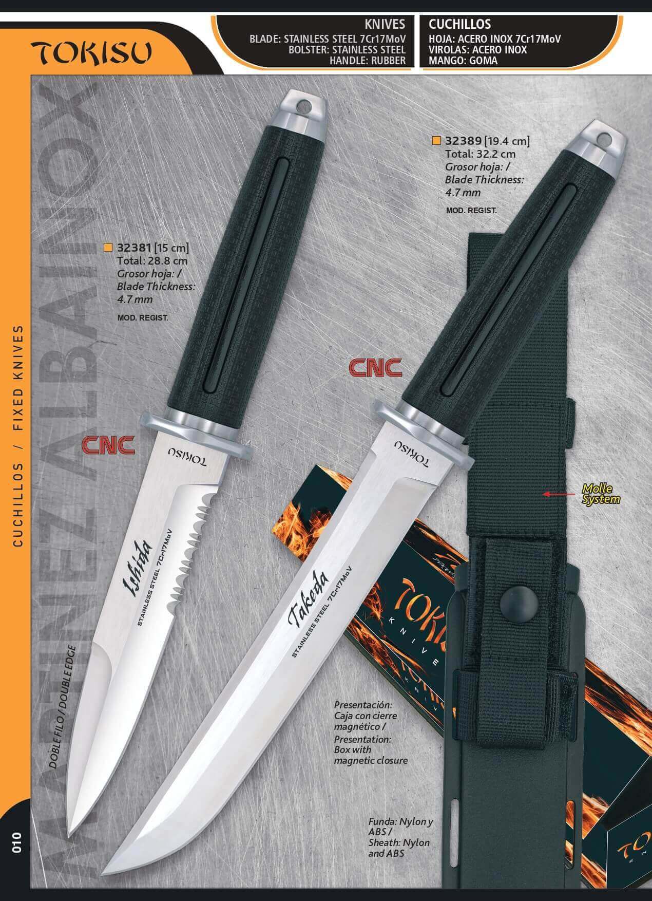 Couteaux tactiques Tokisu avec lame en acier inoxydable, épaisseur 4,7 mm, mitre en acier inoxydable et manche en caoutchouc.