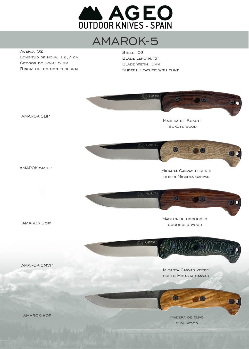 Das Messer hat eine Klinge aus AISI O2 stahl mit einer Länge von 12,7 cm (5") und einer Stärke von 5 mm. Eine robuste und kräftige Vollerlklinge, die Sie bei Ihren Ausflügen ins Gelände begleitet. Mit dem Ageo Amarok Survival-Messer kann Ihnen nichts widerstehen.