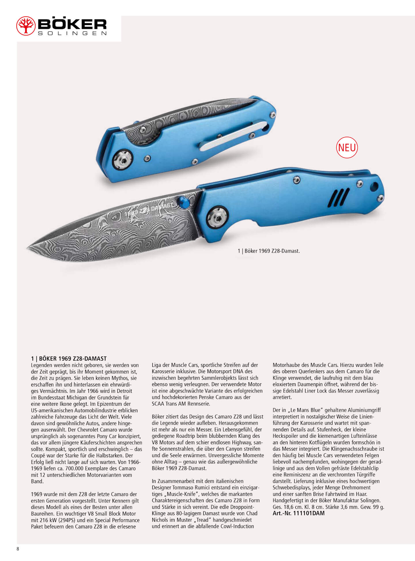 Das Böker 1969 Z28 Damastmesser ist eine markante Sammlerversion, inspiriert vom berühmten Chevrolet Camaro.
