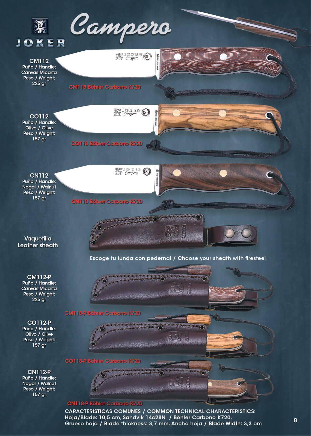 Griff: Micarta braun Leinwand. Blatt: 10,5 cm. Stahlblech Sandvik 14C28N. Lederbezug. Mit Feuerstein.