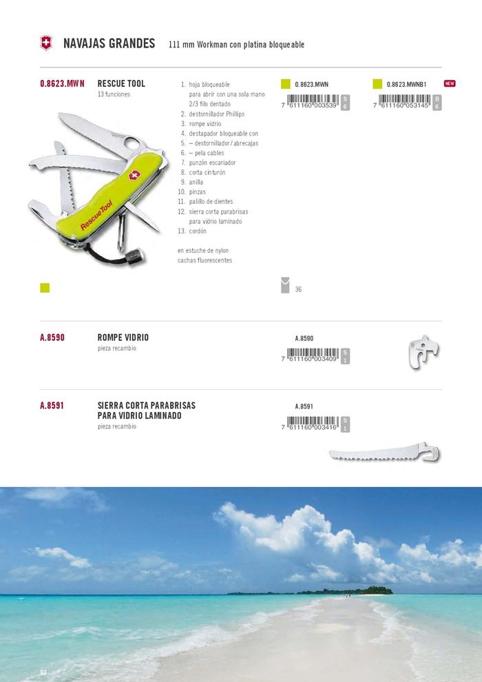 Großes Sägeblatt mit gezackter Kante für eine Handöffnung, Bandschneider, Reibahle, Lochscheibensäge für Verbundglas, Flaschenöffner, 7 mm abschließbarer Schraubendreher, Abisolierzange, 1/2 Kreuzschlitzschraubendreher, Glasbrecher, Ring, Zahnstocher, Pinzette und Kordel. Gewicht: 167 g, 21,5 mm hoch und 111 mm lang. Kompatibler Fall: 4.0851.