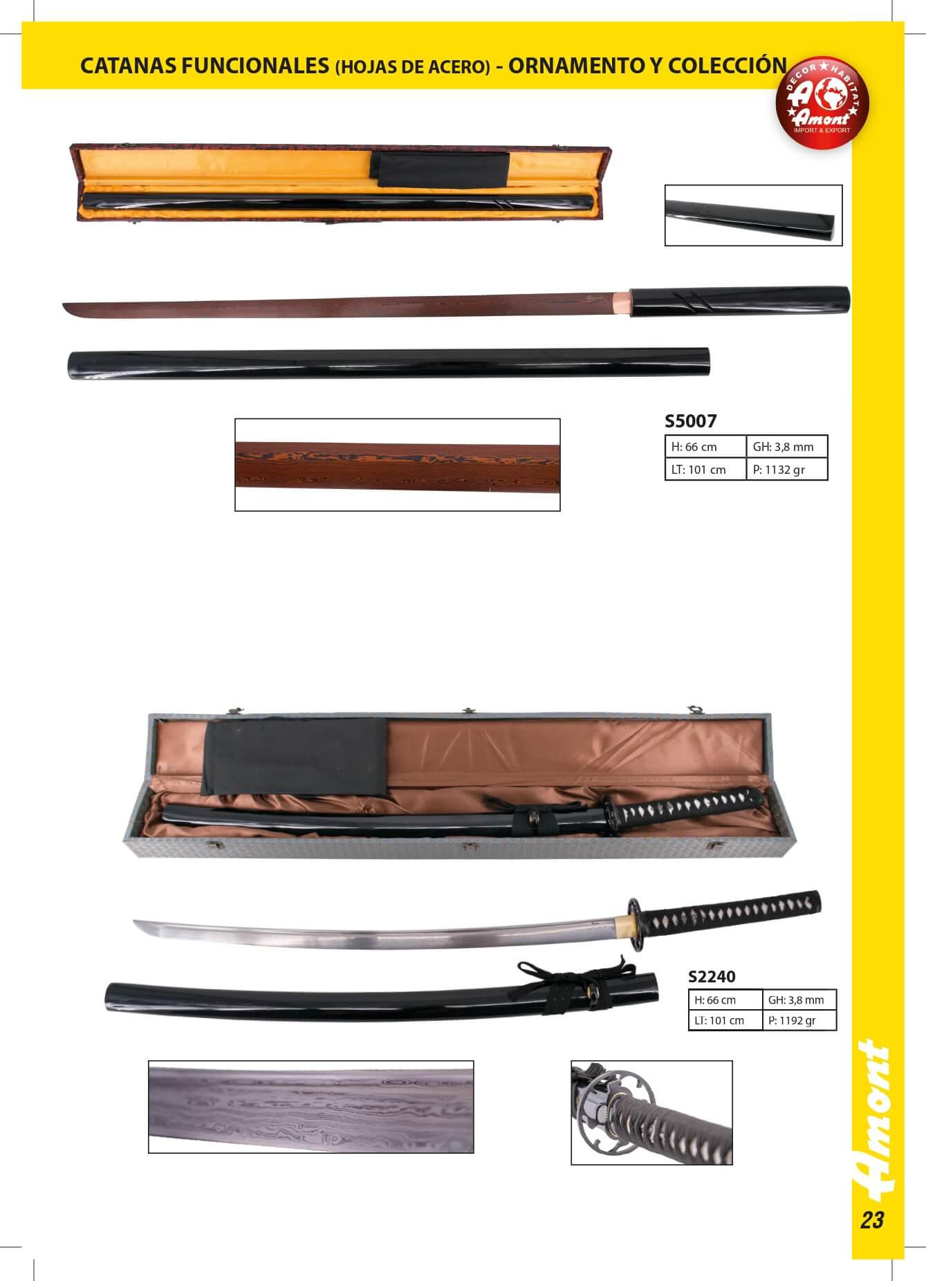Katana S2240 von 102 cm AISI 1045 Damaststahlklinge mit Schneide, mit schwarzer Scheide und schwarzer Besaitung, Griff mit schwarzer Besaitung, mit Halterung und Holzkiste, die mit dekorativem Präsentationsstoff ausgekleidet ist.