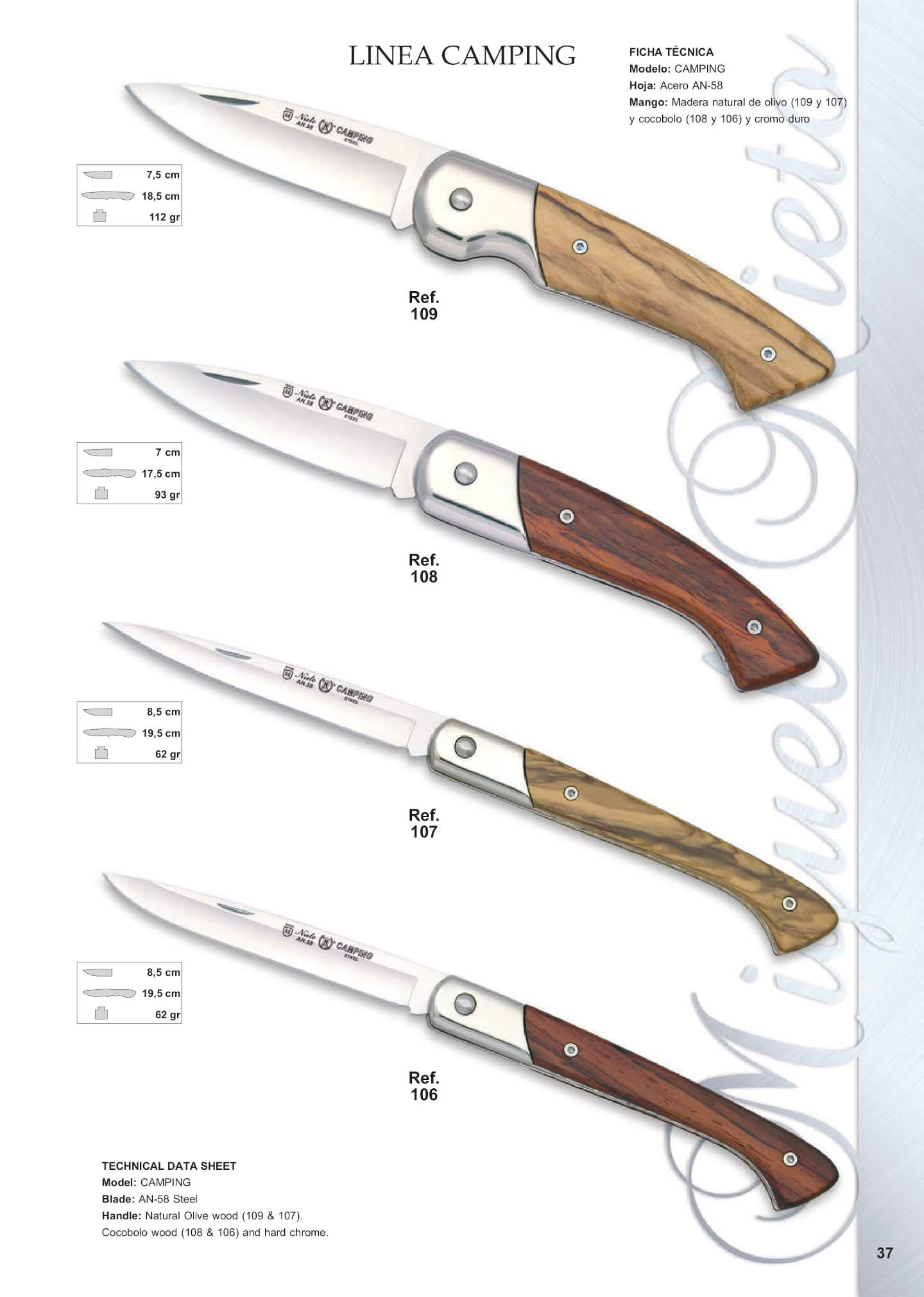 Messer mit einer Klinge aus Stahl AN-58, 7, 7,5 und 8,5 cm. Griff aus Oliven Naturholz (109 und 107) und Cocobolo (108 und 106) und Hartchrom.