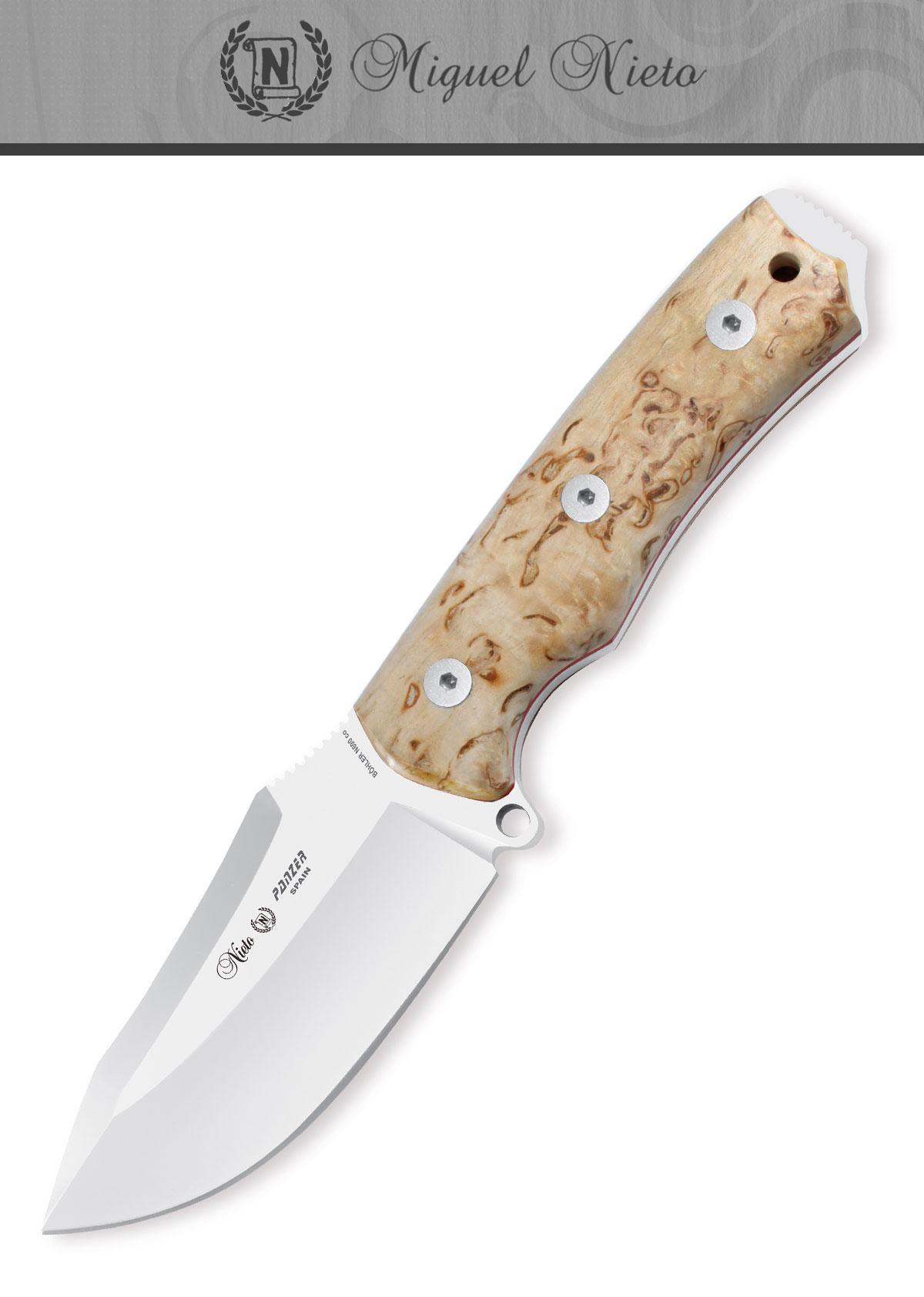 Full Tang Messer mit Birkenholzgriff. Böhler N690Co Stahlklinge mit hohem Chrom- und Kohlenstoffanteil. Dieses Edelstahlmesser hat eine 9,5 cm lange Klinge und eine Drop-Point-Spitze. Blechstärke 5,3 mm.