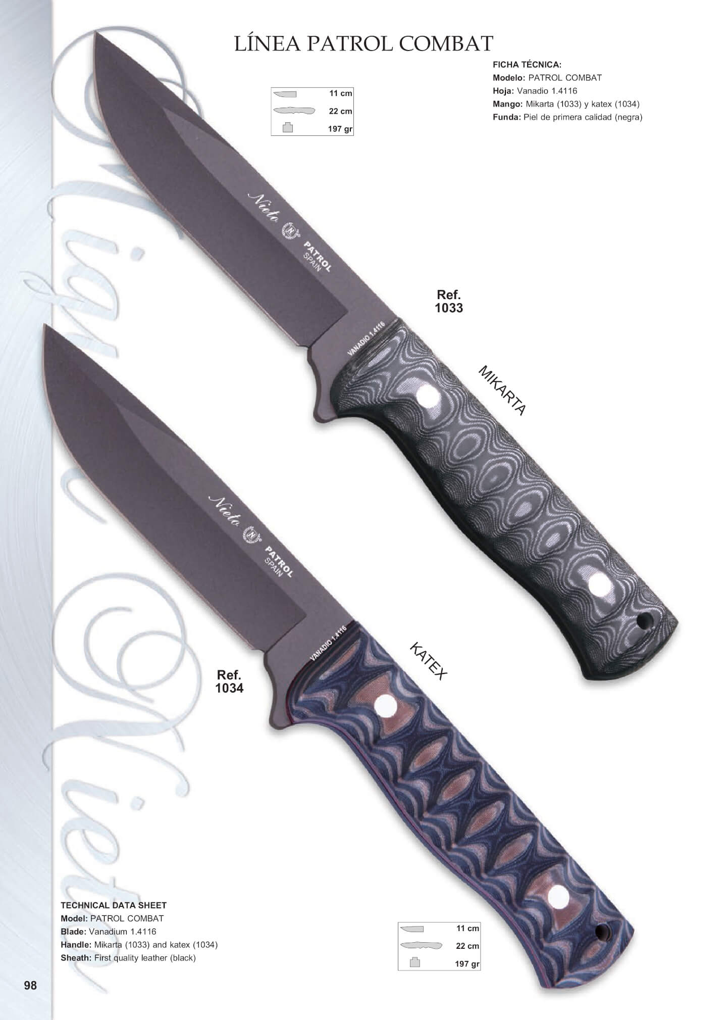 Klinge: 11 cm. Gesamtlänge: 22 cm. Gewicht: 197 grs. Griff: Mikarta.