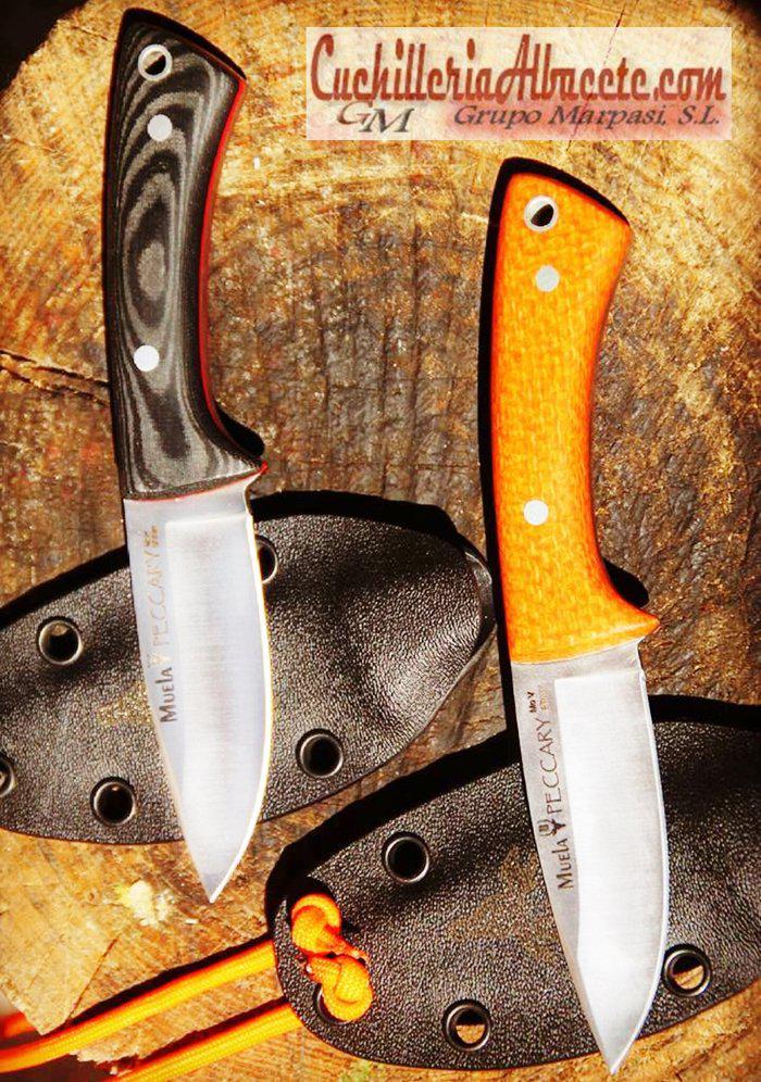 Das Sportmesser Muela PECCARY hat eine integrierte Klinge, schwarze Micarta und orange Leinwand, Kydex Scheide und 550 Pfund Paracord Schnur.