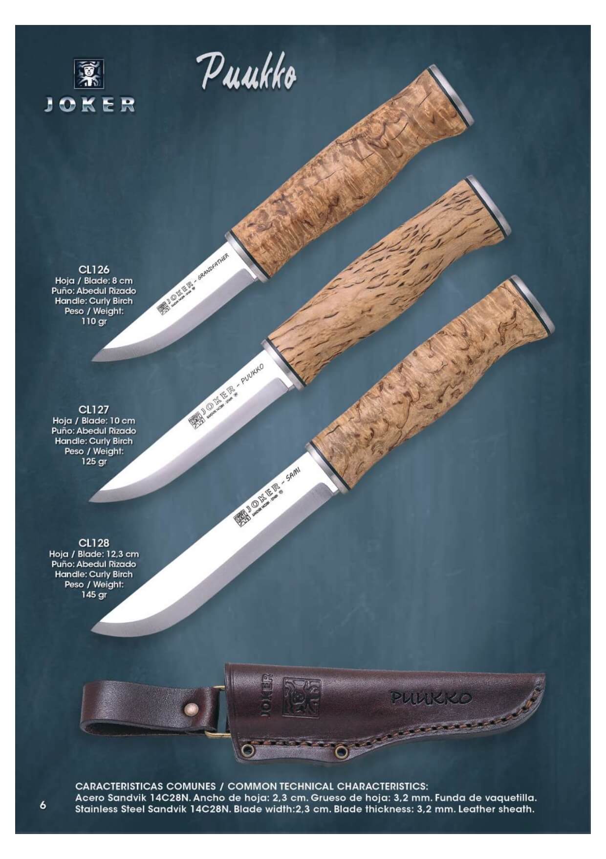 Messer der Puukko Joker-Serie mit einer 3,2 mm starken Sandvik 14C28N-Stahlklinge und einer Kuhfellabdeckung
