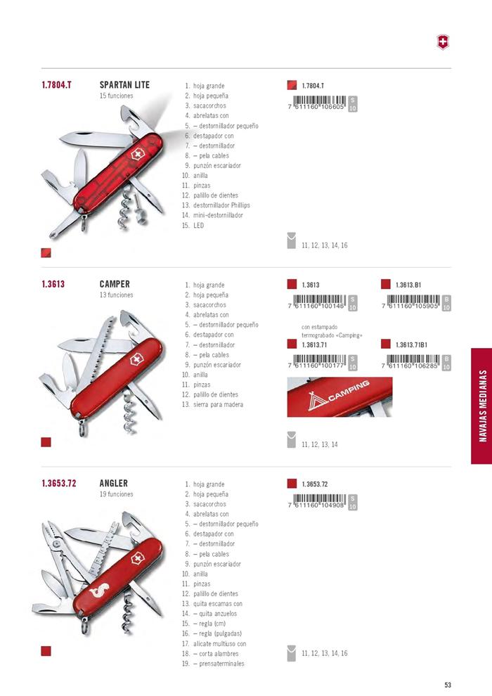 Grosse Klinge, Korkenzieher, Dosenöffner, Schraubenzieher, Nägel Abisolierzange, Korkenzieher, Schere, Mehrzweckhaken, file, Schlüsselring, Pinzette, Zahnstocher, Kugelschreiber, Stift.