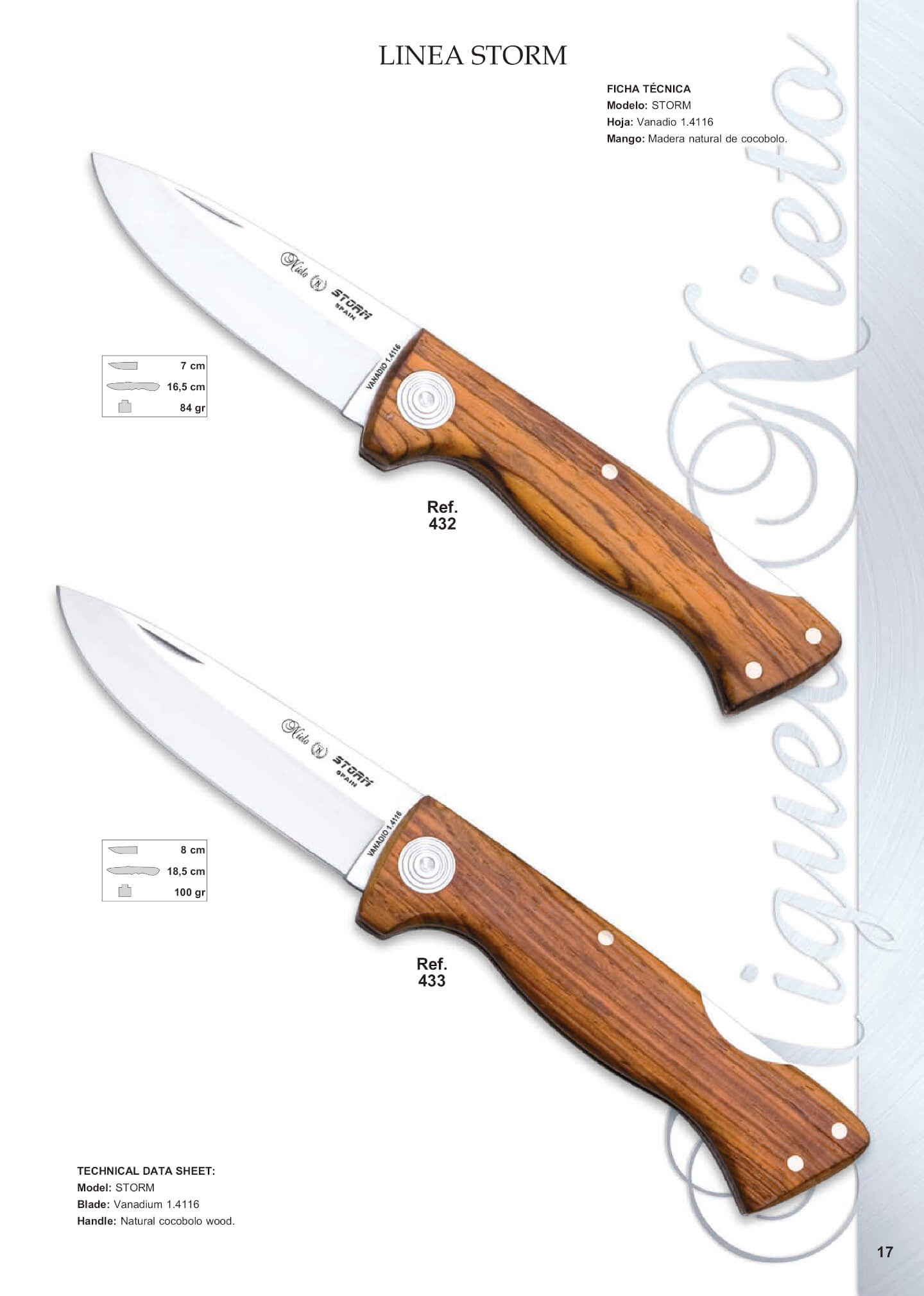 M. Nieto Pocket knive. Linea Storm. Klinge: AN-58 Stahl. 432 Griff: Naturholz aus Cocobolo. Blatt: 7 cm. Gesamtlänge: 16,5 cm. Gewicht 84 gr. 433 Griff: Naturholz aus Cocobolo. Blatt: 8 cm. Gesamtlänge: 18,5 cm. Gewicht 100 gr.